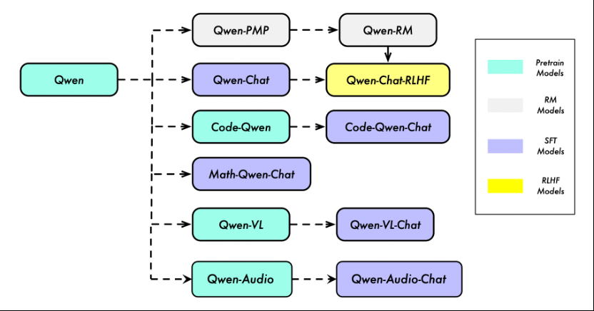 Figure: Overview of the Qwen AI model family, including base pre-trained models (teal), reward models (gray), supervised fine-tuned (SFT) chat models (purple), and RLHF-refined chat models (yellow). The diagram illustrates how the core Qwen LLM feeds into various specialized versions.