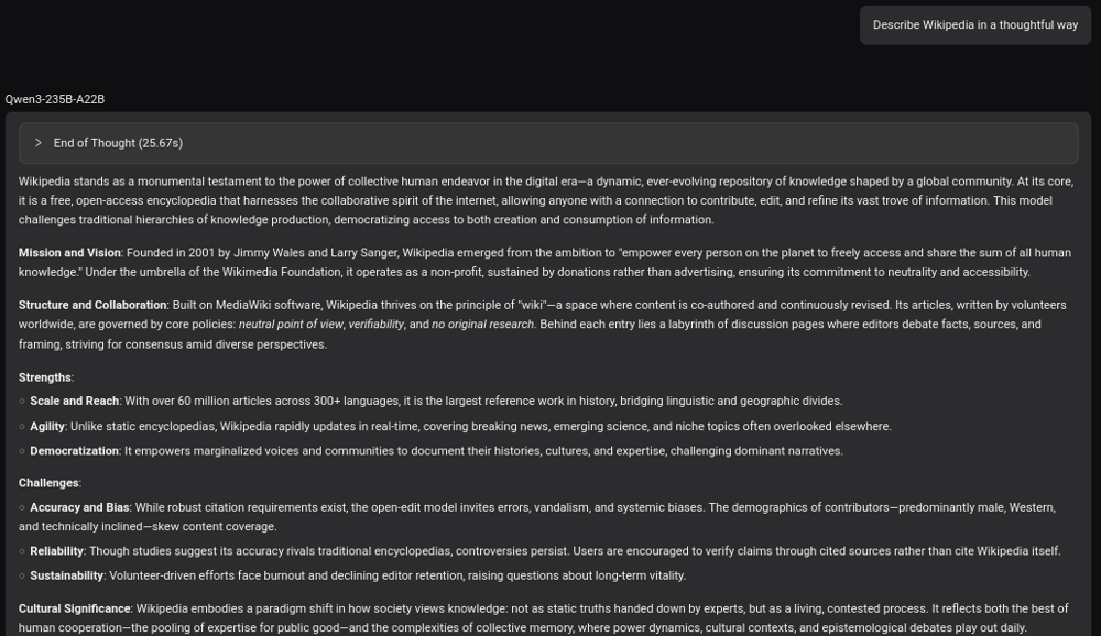 Screenshot of a Qwen-3 chatbot response (with the model’s “Thinking” mode enabled) describing the topic of Wikipedia in a structured, thoughtful manner. Qwen’s answers often enumerate key points (“Strengths”, “Challenges”, etc.), reflecting its detailed and organized style.