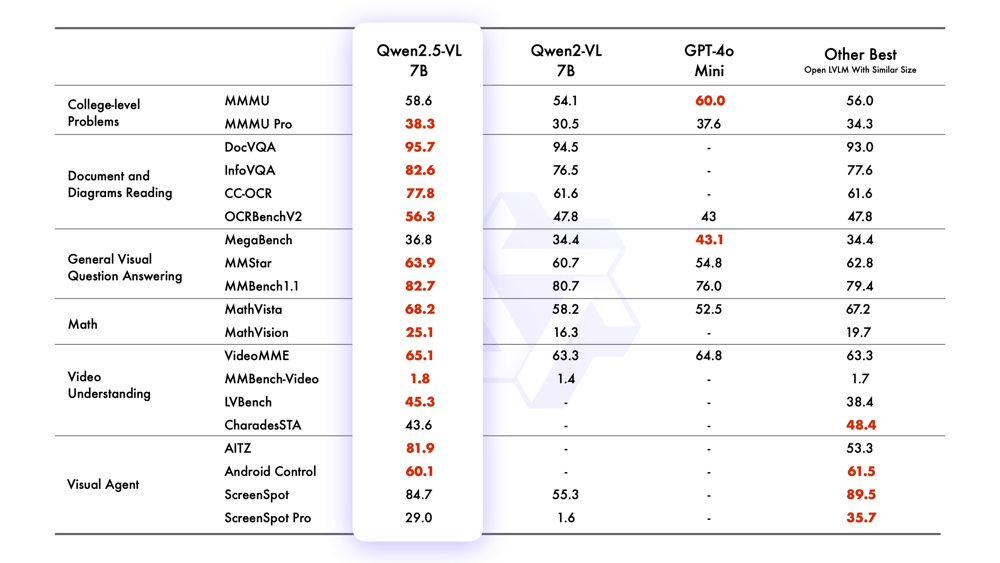 • Visual Question Answering (VQA): The model can answer questions about images, ranging from simple queries (“What color is the car?”) to complex reasoning (“What might this person be feeling based on the picture?”). It has strong performance on both factual VQA (where the answer is directly present in the image) and reasoning VQA (which may require using external knowledge or logical deduction). For instance, Qwen2.5-VL can count objects in an image, compare attributes, or identify relationships (“Is the cat inside or outside the box?”). On the VQAv2 dataset (a standard benchmark for VQA), Qwen2.5-VL is competitive with other top models in accuracy. The model also demonstrated high scores on more specialized VQA benchmarks like InfoVQA (information-seeking QA on charts/graphics) and DocVQA (question answering on document images), outperforming even some proprietary models in these domains.